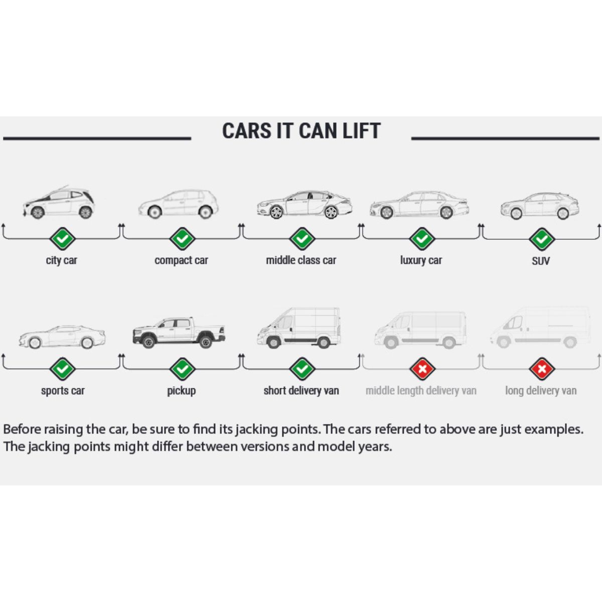 Lyften är utrustad med asymmetriska lyftarmar, där de främre armarna är kortare och de bakre längre. Detta gör det enklare att positionera fordonet korrekt vid lyft.