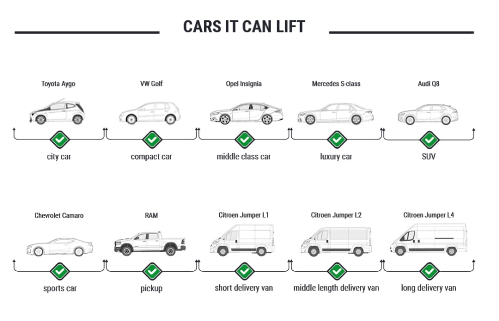 - Lyfter både personbilar, SUV:ar och transportbilar