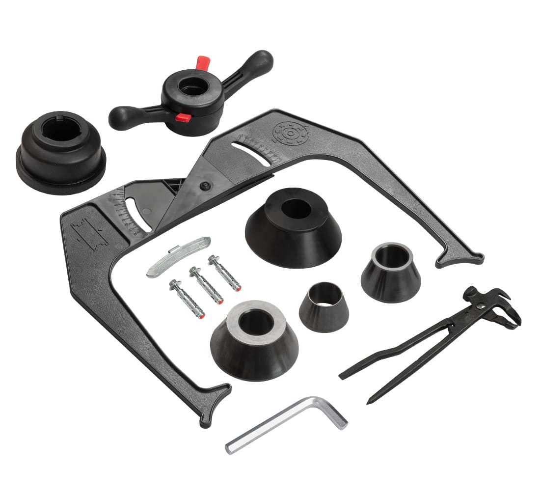 - Standardutrustning: 4 × centreringskoner (40 – 132 mm), vikttång, plastskjutmått, hjulskydd, snabbmutter, liten bussning, stor bussning, gängad axel 40 mm, pappersmanual