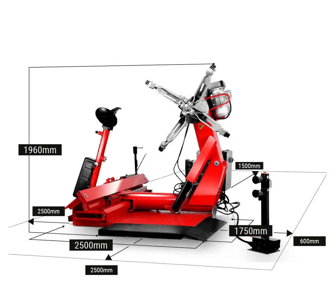 MT-56 klarar däck upp till 2500 mm i diameter och en hjulvikt på upp till 2000 kg. Den robusta konstruktionen och den helautomatiska funktionen säkerställer snabb, exakt och säker däckservice – även under tung och kontinuerlig belastning.