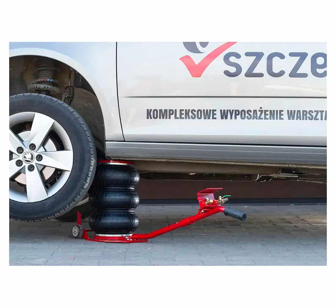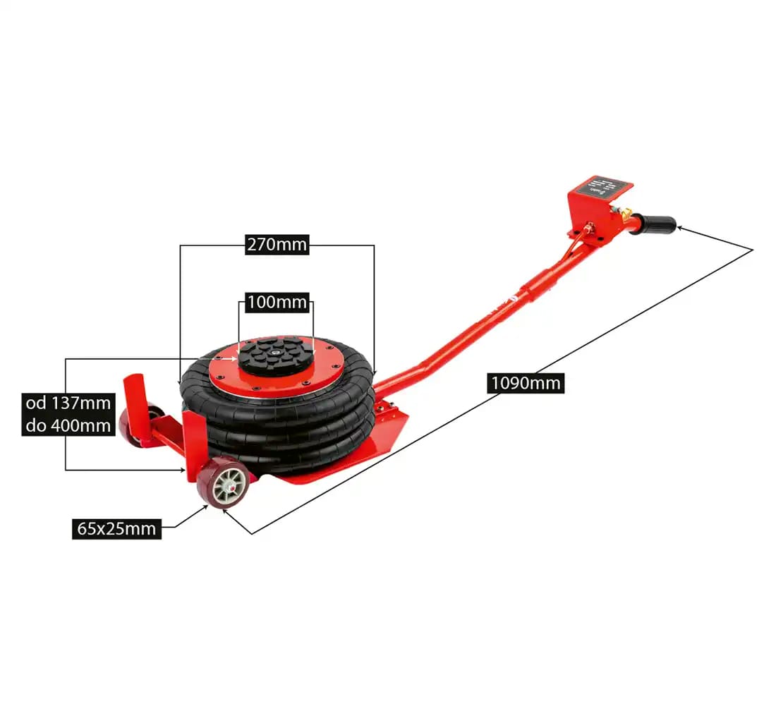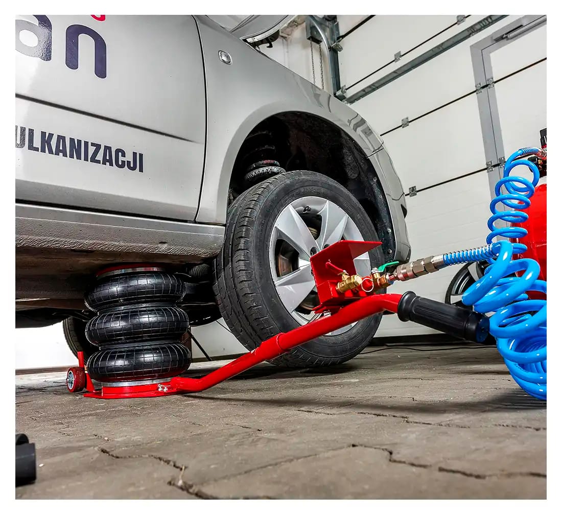 Den tryckluftsdrivna konstruktionen gör lyftet snabbt och enkelt, vilket gör domkraften perfekt för både verkstäder och garage.